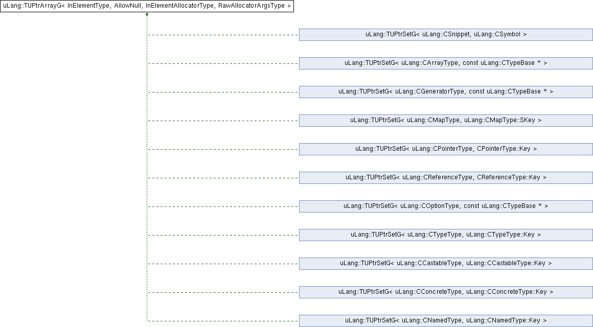 Inheritance diagram for uLang::TUPtrArrayG< InElementType, AllowNull, InElementAllocatorType, RawAllocatorArgsType >:Public Types | |