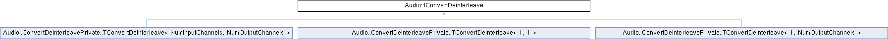 Inheritance diagram for Audio::IConvertDeinterleave:Public Member Functions | |