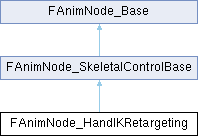 Inheritance diagram for FAnimNode_HandIKRetargeting:Node to handle re-targeting of Hand IK bone chain. It looks at position in Mesh Space of Left and Right FK bones, and moves Left and Right IK bones to those. based on HandFKWeight. (0 = favor left hand, 1 = favor right hand, 0.5 = equal weight). This is used so characters of different proportions can handle the same props.