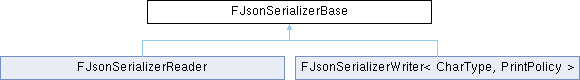 Inheritance diagram for FJsonSerializerBase:Base interface used to serialize to/from JSON. Hides the fact there are separate read/write classes