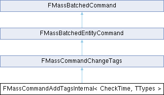 Inheritance diagram for FMassCommandAddTagsInternal< CheckTime, TTypes >:Public Types | |