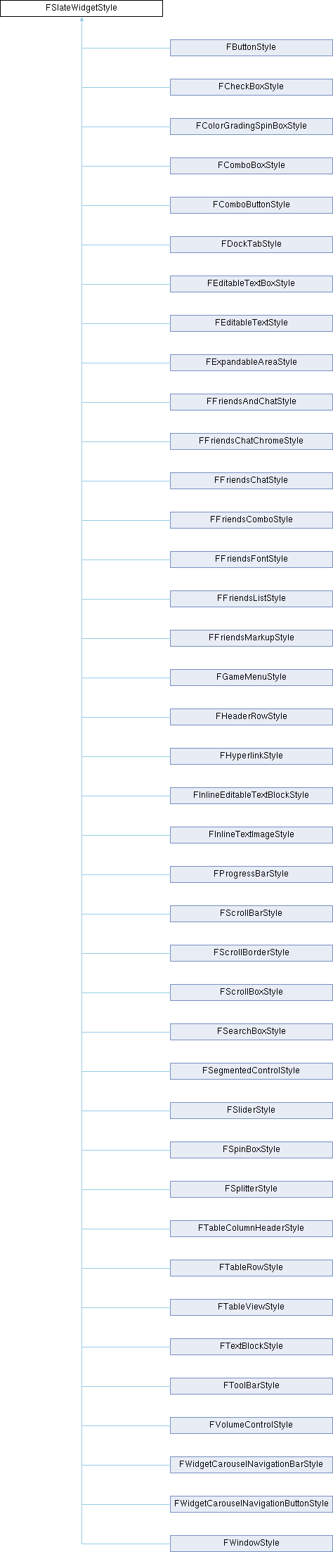 Reimplemented in FColorGradingSpinBoxStyle, FFriendsAndChatStyle, FFriendsChatChromeStyle, FFriendsChatStyle, FFriendsComboStyle, FFriendsFontStyle, FFriendsListStyle, FFriendsMarkupStyle, FGameMenuStyle, FSegmentedControlStyle, FCheckBoxStyle, FTextBlockStyle, FButtonStyle, FComboButtonStyle, FComboBoxStyle, FHyperlinkStyle, FEditableTextStyle, FScrollBarStyle, FEditableTextBoxStyle, FInlineEditableTextBlockStyle, FProgressBarStyle, FExpandableAreaStyle, FSearchBoxStyle, FSliderStyle, FVolumeControlStyle, FInlineTextImageStyle, FSpinBoxStyle, FSplitterStyle, FTableViewStyle, FTableRowStyle, FTableColumnHeaderStyle, FHeaderRowStyle, FDockTabStyle, FScrollBoxStyle, FScrollBorderStyle, FWindowStyle, FToolBarStyle, FWidgetCarouselNavigationButtonStyle, and FWidgetCarouselNavigationBarStyle.
