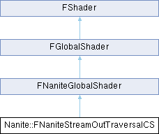 Inheritance diagram for Nanite::FNaniteStreamOutTraversalCS:Public Types | |