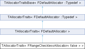 Inheritance diagram for TAllocatorTraits< FRangeChecklessAllocator< false > >:Additional Inherited Members | |