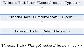 Inheritance diagram for TAllocatorTraits< FRangeChecklessAllocator< true > >:Additional Inherited Members | |