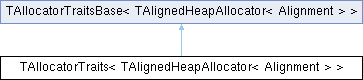 Inheritance diagram for TAllocatorTraits< TAlignedHeapAllocator< Alignment > >:Public Types | |