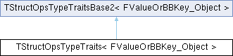 Inheritance diagram for TStructOpsTypeTraits< FValueOrBBKey_Object >:Public Types | |