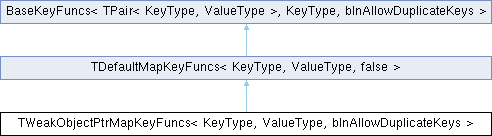 Inheritance diagram for TWeakObjectPtrMapKeyFuncs< KeyType, ValueType, bInAllowDuplicateKeys >:Public Types | |