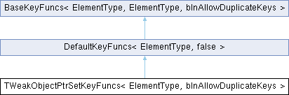 Inheritance diagram for TWeakObjectPtrSetKeyFuncs< ElementType, bInAllowDuplicateKeys >:Public Types | |