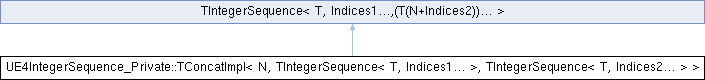 Inheritance diagram for UE4IntegerSequence_Private::TConcatImpl< N, TIntegerSequence< T, Indices1... >, TIntegerSequence< T, Indices2... > >:Public Types | |