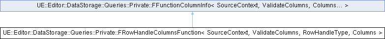 Inheritance diagram for UE::Editor::DataStorage::Queries::Private::FRowHandleColumnsFunction< SourceContext, ValidateColumns, RowHandleType, Columns >:Public Types | |