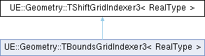 Inheritance diagram for UE::Geometry::TShiftGridIndexer3< RealType >:Public Member Functions | |