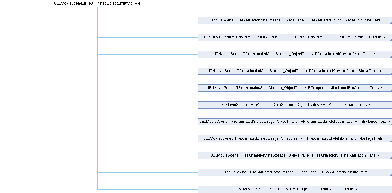 Inheritance diagram for UE::MovieScene::IPreAnimatedObjectEntityStorage:Public Member Functions | |