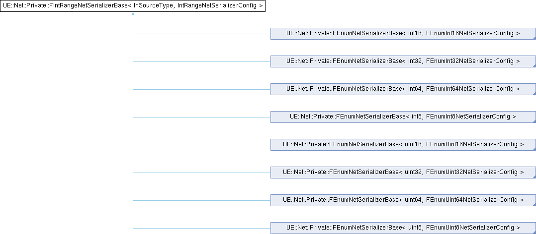 Inheritance diagram for UE::Net::Private::FIntRangeNetSerializerBase< InSourceType, IntRangeNetSerializerConfig >:Public Types | |