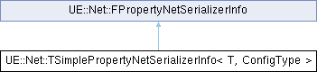 Inheritance diagram for UE::Net::TSimplePropertyNetSerializerInfo< T, ConfigType >:Public Member Functions | |