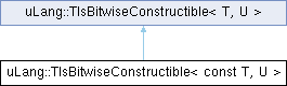 Inheritance diagram for uLang::TIsBitwiseConstructible< const T, U >:Additional Inherited Members | |